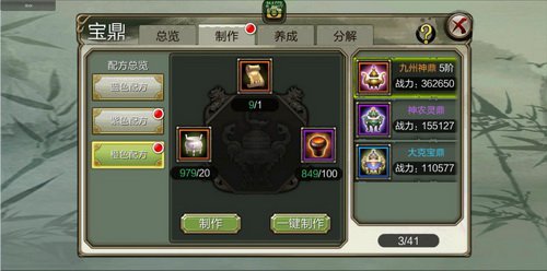 宝鼎的制造资料由宝鼎卷轴,鼎胚和锻胚熔剂组成,不同品阶的宝鼎需求不同品阶的资料。制造蓝色、紫色宝鼎的资料可经过宝鼎日常使命和挑战少室山副本躲藏首领获制造橙色宝鼎的资料可经过宝鼎日常使命。