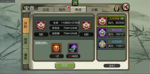 问鼎全国活动,炼狱少室山副本躲藏首领取得,宝鼎制造完成后,经过养成还可大幅度提升宝鼎的特点加成,紫色质量以上的宝鼎均可经过重炼来改动附加特点。