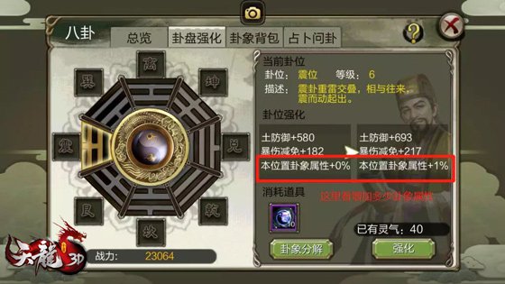 八卦首要分為卦位和卦象兩部分。在【八卦】→【卦盤強化】分頁能夠看到卦位,強化卦位能取得特點和战力的提高,卦位強化到必定等級時分,也能提高本位置的卦象特點。
