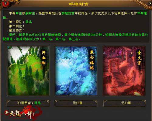 在每周日15:00-16:00,帮会的帮主或副帮主可作为队长,组织一个所有成员等级均≥90级的6人部队报名参与群雄封赏活动。报名后,依据各报名小队配备总评分排序,配备总评分前8名的帮会部队可以参与属地争夺。具有参赛资历的8个部队通过6V6的PK,将决出前三名。前三可依据排名顺序,在必定时刻内选择指定场景作为帮会属地,若未在必定时刻内做出选择,则会随机分配一个尚未被选择的属地。