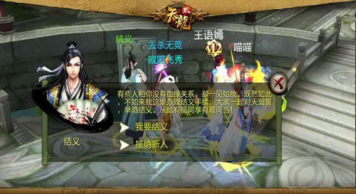 友谊提示:江湖凶险宜结伴而行从古至今,侠义人士对天盟誓兄弟抱团便是对抗江湖恶势力的一个绝佳好办法。玩家角色等级到达40级以后,2-4人即可组成结拜队伍。