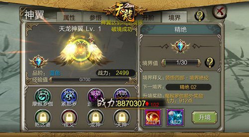 神翼的境地共分为五重:分别为精绝、小成、大成、入化、出神,玩家能够经过新活动“勇闯灵鹫宫”取得材料来不断强化。当境地达到对应层数时,将会参悟八部特点,穿透等特别特点全方位加持,火力全开,征战疆场有如神助!