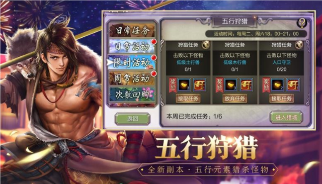 进入猎场击杀指定五行兽,赢取元宝、五行结晶等道具奖励,还能拾取遗留的瑰宝!玩家进入场景将顺便继续若干小时免疫内外功的buff效果,仅可受到元素伤害。